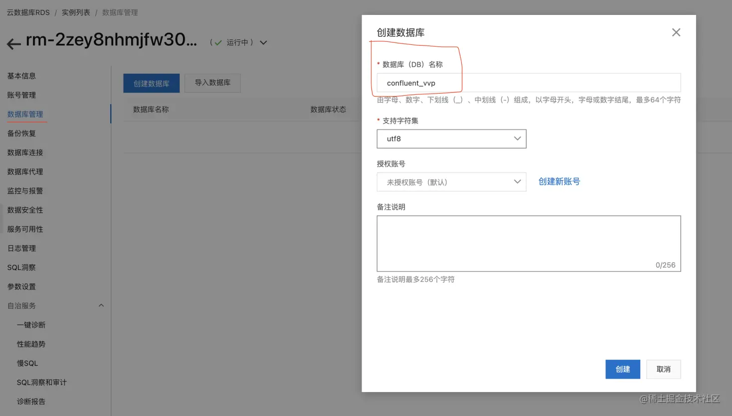 - 数据库实例下【数据库管理】新建数据库【conflufent_vvp】