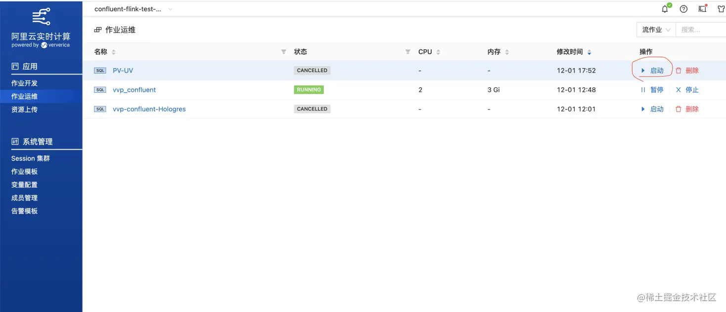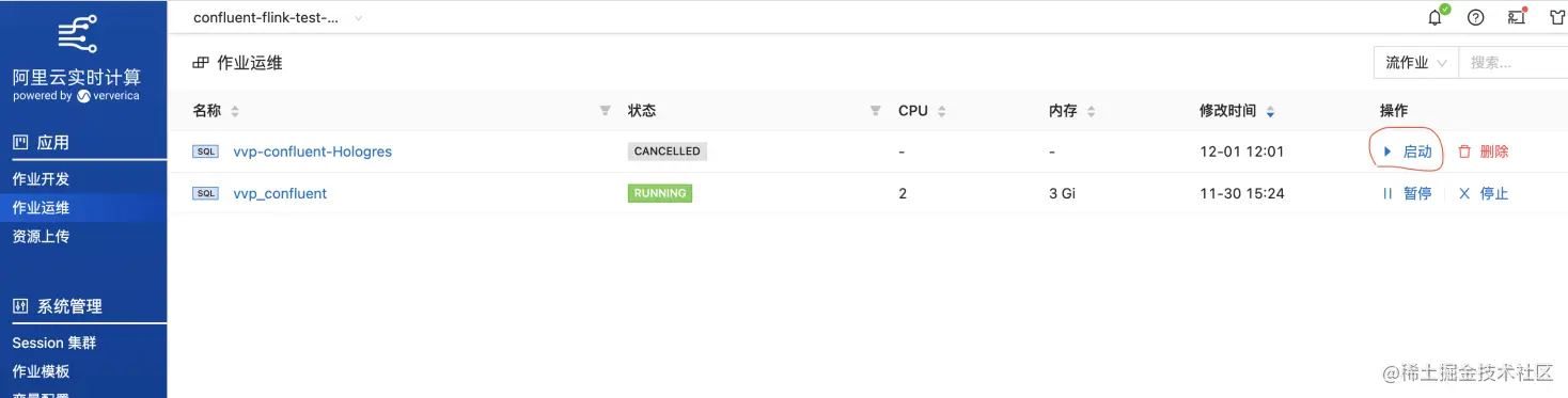 点击【上线】之后,在作业运维页面点击启动按钮,直到状态更新为RUNNING状态。