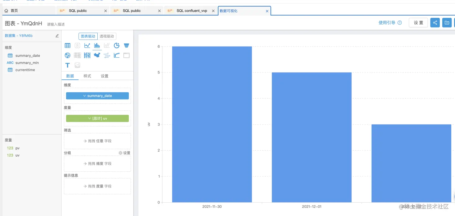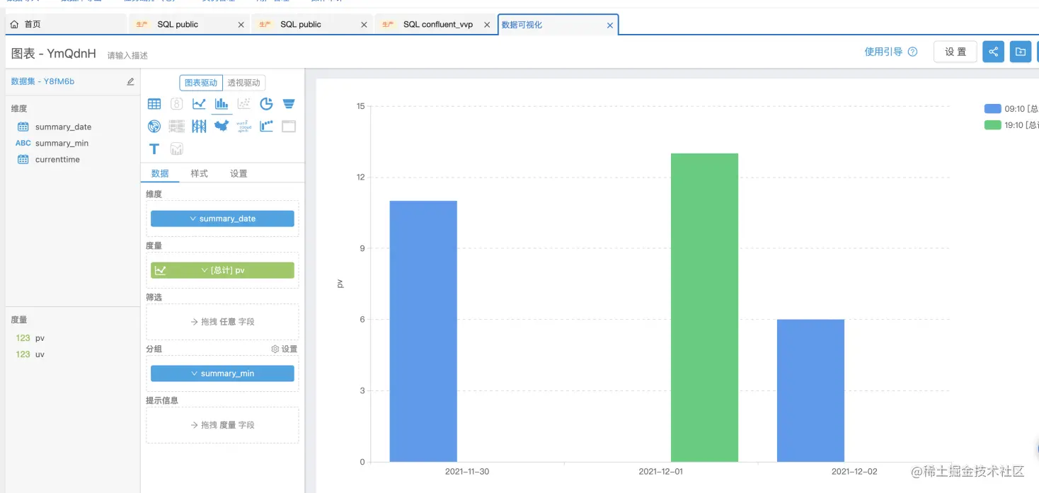 可以看出rds数据表的pv和uv会随着发送的消息数据,动态的变化,同时还可以通过【数据可视化】来查看相应的图表信息。