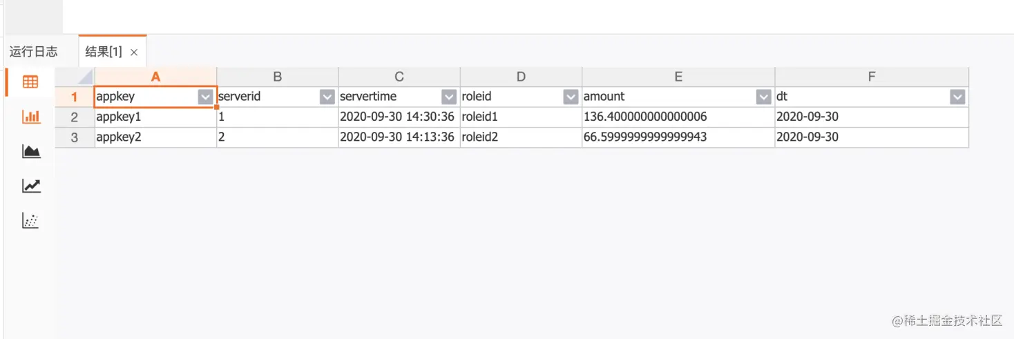{"appkey":"appkey1","servertime":"2020-09-30 14:10:36","consumenum":33.8,"roleid":"roleid1","serverid":"1"} {"appkey":"appkey2","servertime":"2020-09-30 14:11:36","consumenum":30.8,"roleid":"roleid2","serverid":"2"} {"appkey":"appkey1","servertime":"2020-09-30 14:13:36","consumenum":31.8,"roleid":"roleid1","serverid":"1"} {"appkey":"appkey2","servertime":"2020-09-30 14:20:36","consumenum":33.8,"roleid":"roleid2","serverid":"2"} {"appkey":"appkey1","servertime":"2020-09-30 14:30:36","consumenum":73.8,"roleid":"roleid1","serverid":"1"}