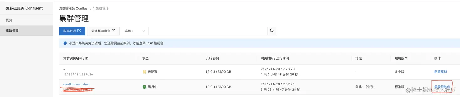 - 登录Confluent管理控制台,创建Confluent集群,创建步骤参考 Confluent集群开通