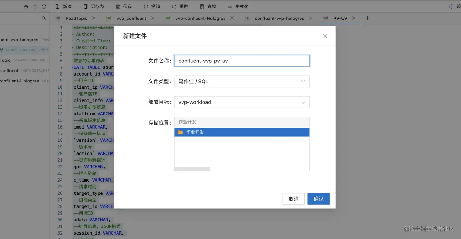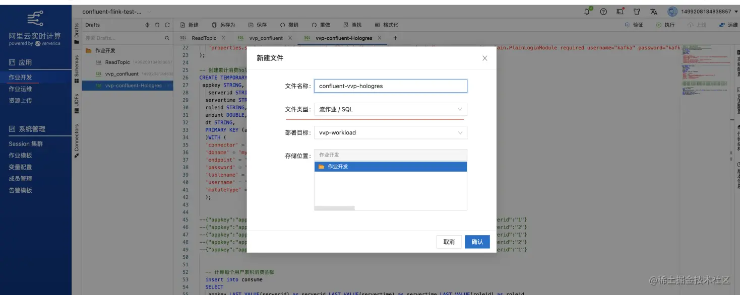 - 点击作业开发Tab,点击新建文件,文件名称:confluent-vvp-hologres,文件类型选择:流作业/SQL