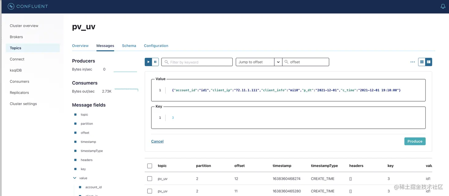 - 在左侧选中Topics,点击Add a topic按钮,创建一个名为confluent-vvp-test的topic,将partition设置为3