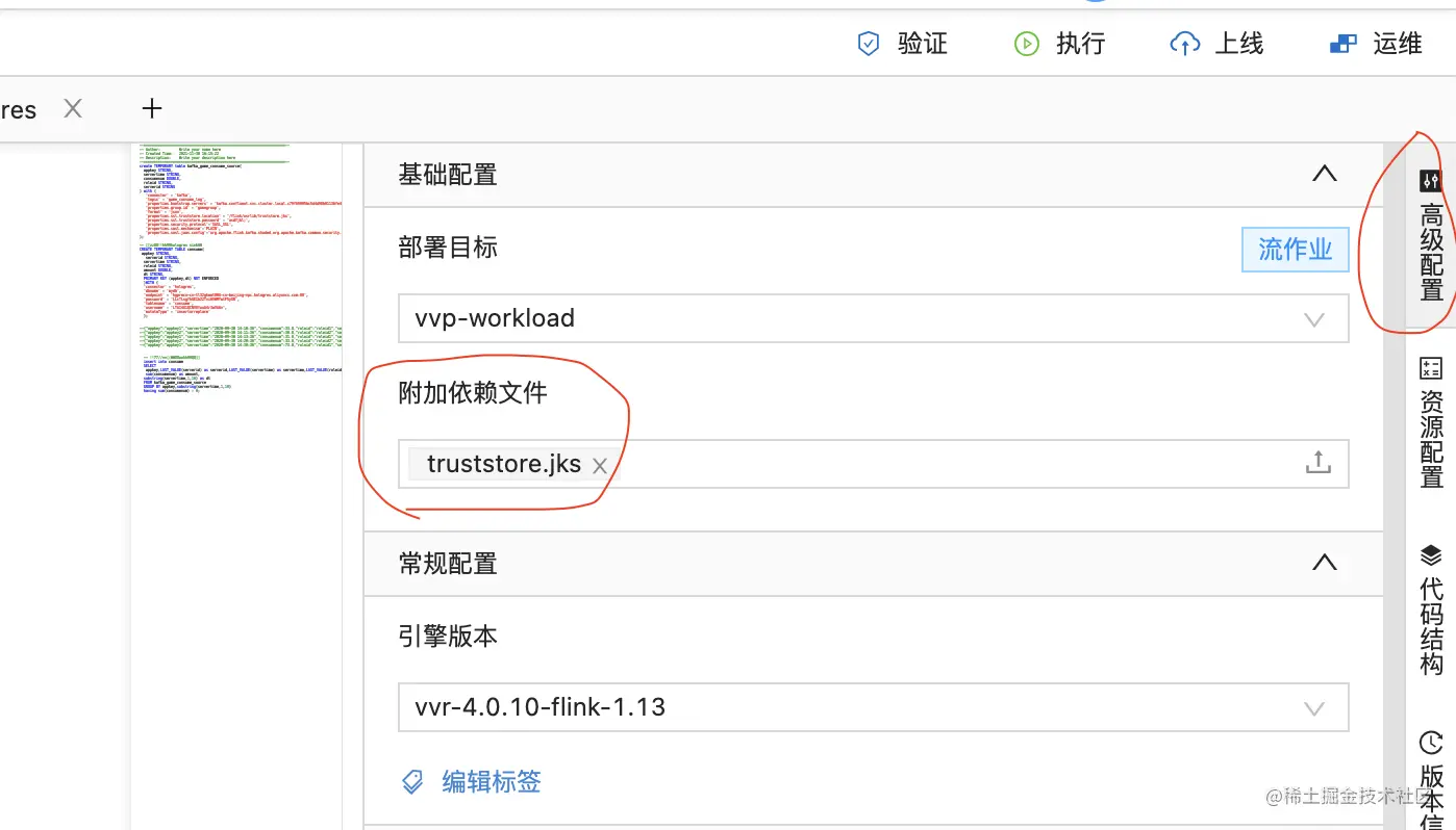 在高级配置里,增加依赖文件truststore.jks(访问内部域名得添加这个文件,访问公网域名可以不用),访问依赖文件的固定路径前缀都是/flink/usrlib/(这里就是/flink/usrlib/truststore.jks)