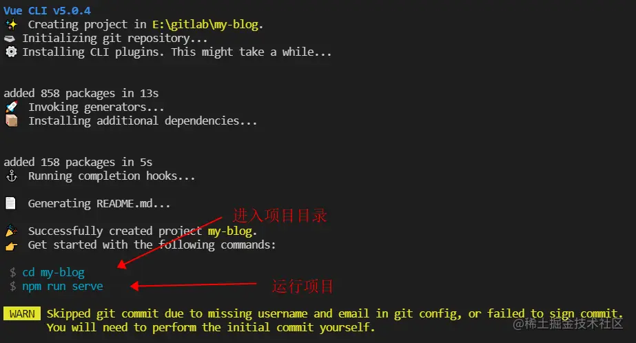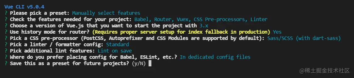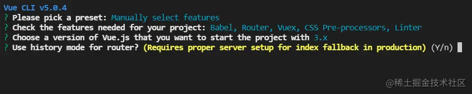 根据自己的喜好通过doc命令定位到对应文件夹位置,输入vue create my-blog创建项目,my-blog是项目名,接下来是一系列的问答进行配置