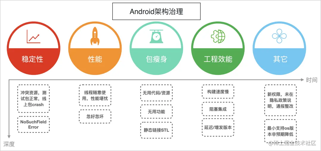 笔者在Android架构领域有多年经验,直接负责或者间接参与了稳定性、启动性能、包瘦身、工程效能、新版本os适配等多个方向,随着各治理项的不断深入以及时间的推移,遇到过各种各样的问题,例如:冲突资源导致即使代码无变化,多次构建后的apk中也会出现资源值不一致,最终引发线上问题;java代码修改导致不兼容调用,最终引发线上java异常;线程随意使用,缺乏统一管控,一方面性能堪忧,另一方面过多线程数量超过某些设备的自定义限制,从而引发OOM异常;无用代码&资源&功能模块,导致包体积持续增加;apk构建耗时越来越长,严重影响研发效率;这样的例子,可以举出几十项,此处不再一一赘述。