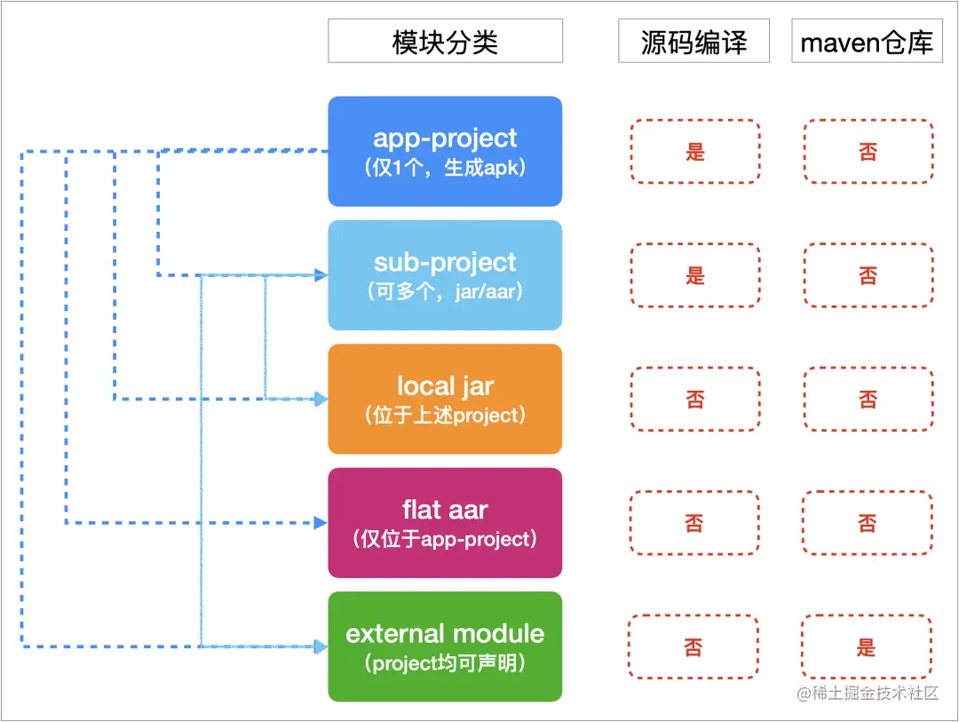 上图展示了5种模块类型,以及几个维度:在apk构建过程中是否需要经历源码编译、是否在maven仓库中存在,以及可能存在的依赖关系。下面分别进行讲解: