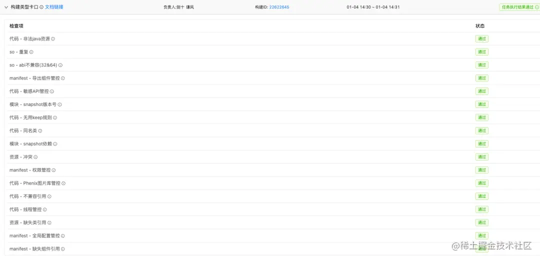 以平台模式为例,每次提交测试/集成时,apk构建都会触发卡口检测,如果有卡口项未通过则阻断流程。卡口结果示例如下: