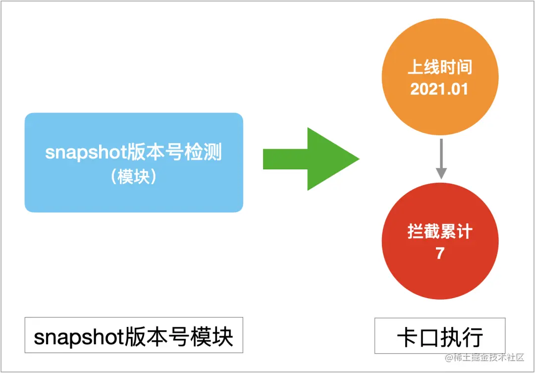 进一步,在app版本迭代关键节点,例如:集成、灰度/正式版本发布,利用此项检测能力形成卡口。优酷在几年前,就已经以本地卡口形式(apk构建失败)上线此功能,并在2021年将此卡口融入到整个卡口体系,成为其中一个卡口项,累计拦截7次,有效防止snapshot版本模块引入到apk构建过程中。