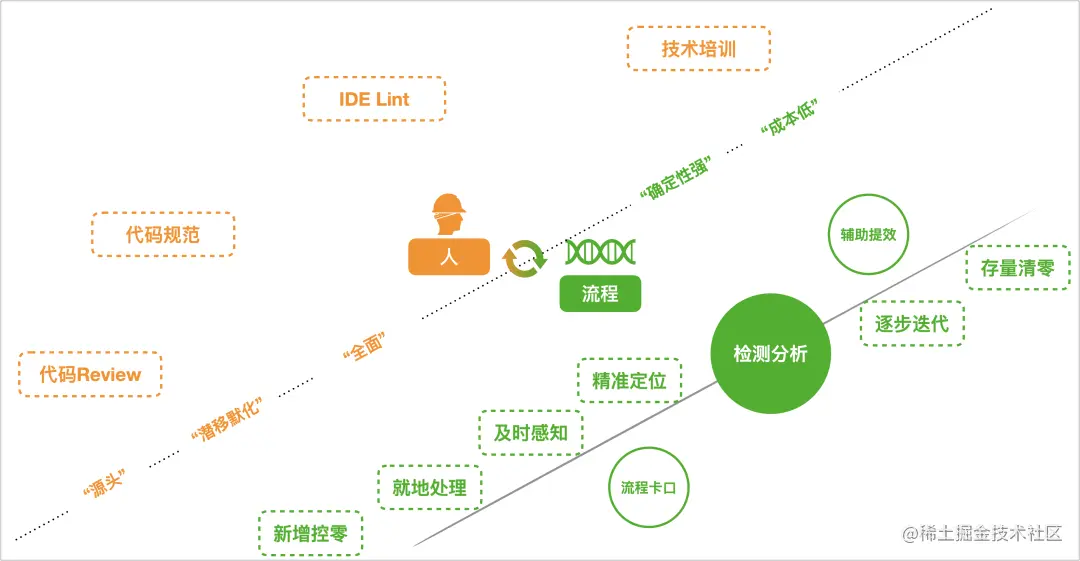 对于人这个因素,业界已经有非常成熟有效的做法,例如:进行代码review、制定代码规范、定制IDE的Lint规则、持续进行技术培训等,这些都能够提高开发者的代码设计和编码水平,从而在源头减少腐化代码产生。此外,能够潜移默化的提高研发团队整体工程质量和素养,对工程质量带来更为全面的提升。但是,这种方式有一些问题,也绝不能忽视:参与到一个工程的开发者,其技术认知、水平、理解能力并不一致,这些规范/规则的执行效果难以保障,带来的潜在成本可能也会很高。