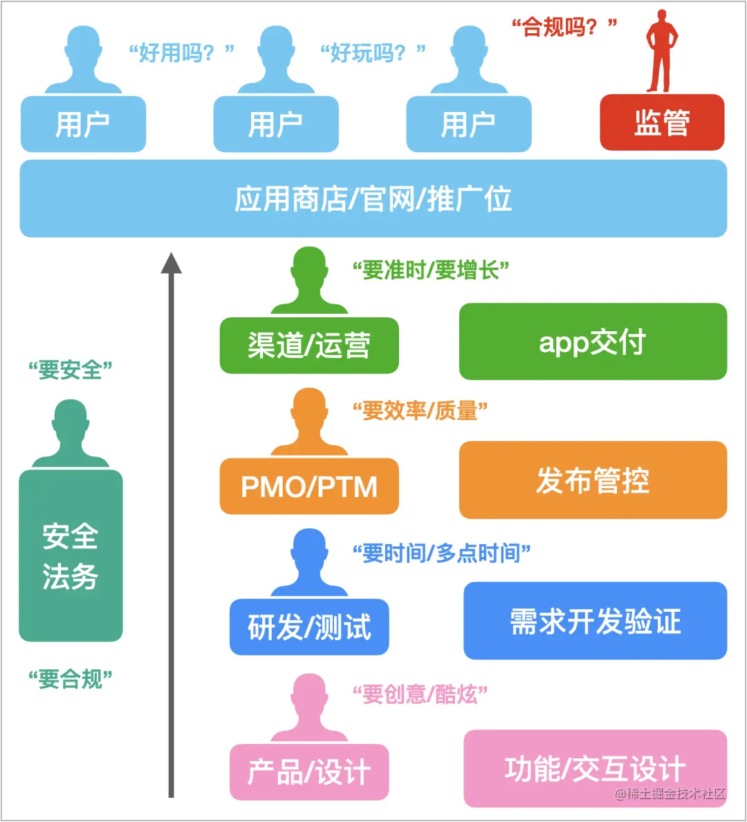前面讲到有很多因素会导致工程腐化产生,但最源头因素只有两个:时间和人。时间意味着工程外部环境的变化,例如:目标设备中os版本号会不断升级、研发工具链、IDE等迭代更新,一份静止不动的工程代码,会随着时间的推移慢慢腐化。相比时间对工程腐化带来的慢变性影响,由人主导的快速工程迭代,才是工程快速腐化的最大来源。既然如此,我们就重点看看一个app版本迭代&交付过程中,都有哪些角色参与,其核心诉求分别是什么,工程腐化又如何在这样的“土壤”中不断积累。