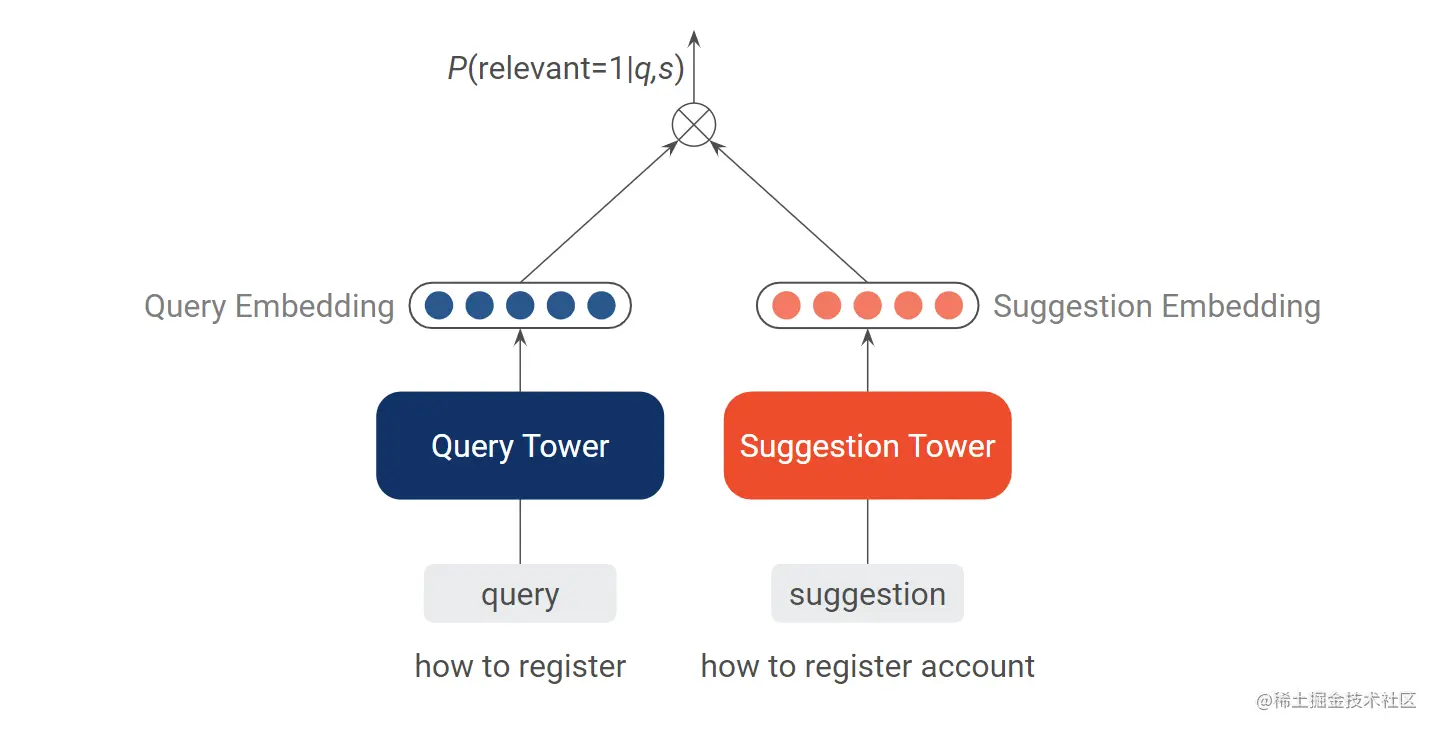 在双塔模型[2] 中,我们分别有 query 塔和 suggestion 塔分别对用户输入 query 和推荐 suggestion 进行编码,映射到稠密向量。基于 query 和 suggestion 的向量,可以计算两者的相似度,如余弦相似度。对于相关的 query 和 suggestion,我们希望两者的相似度越大,反之希望其相似度越小。因此根据该相似度与 query 和 suggestion 是否相关,可以计算损失,训练模型。