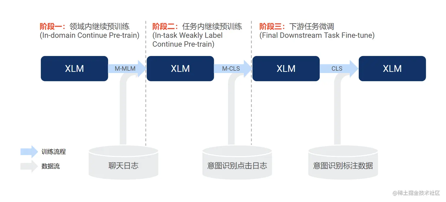 由于 Facebook 的 XLM 基于公开数据进行训练,为了使其能更好地适配我们的场景和数据,我们通过继续使用领域内和任务内的语料库进行继续预训练(continue pre-train)来提升模型性能。具体来说,参考文献[4],我们使用 3 阶段方法: