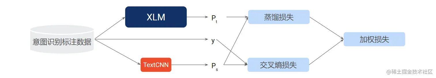 为了使大型预训练语言模型可用于在线服务,我们进一步对其进行知识蒸馏[5],将大模型(teacher)变成更小的模型(student),如 TextCNN,示意图如上图所示。