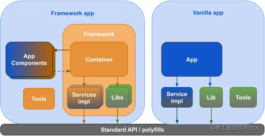 - 你的代码与其他框架运行时或你想要使用的其他框架组件库没有互操作性:由于规则不同,大多数框架彼此之间很难实现互操作。