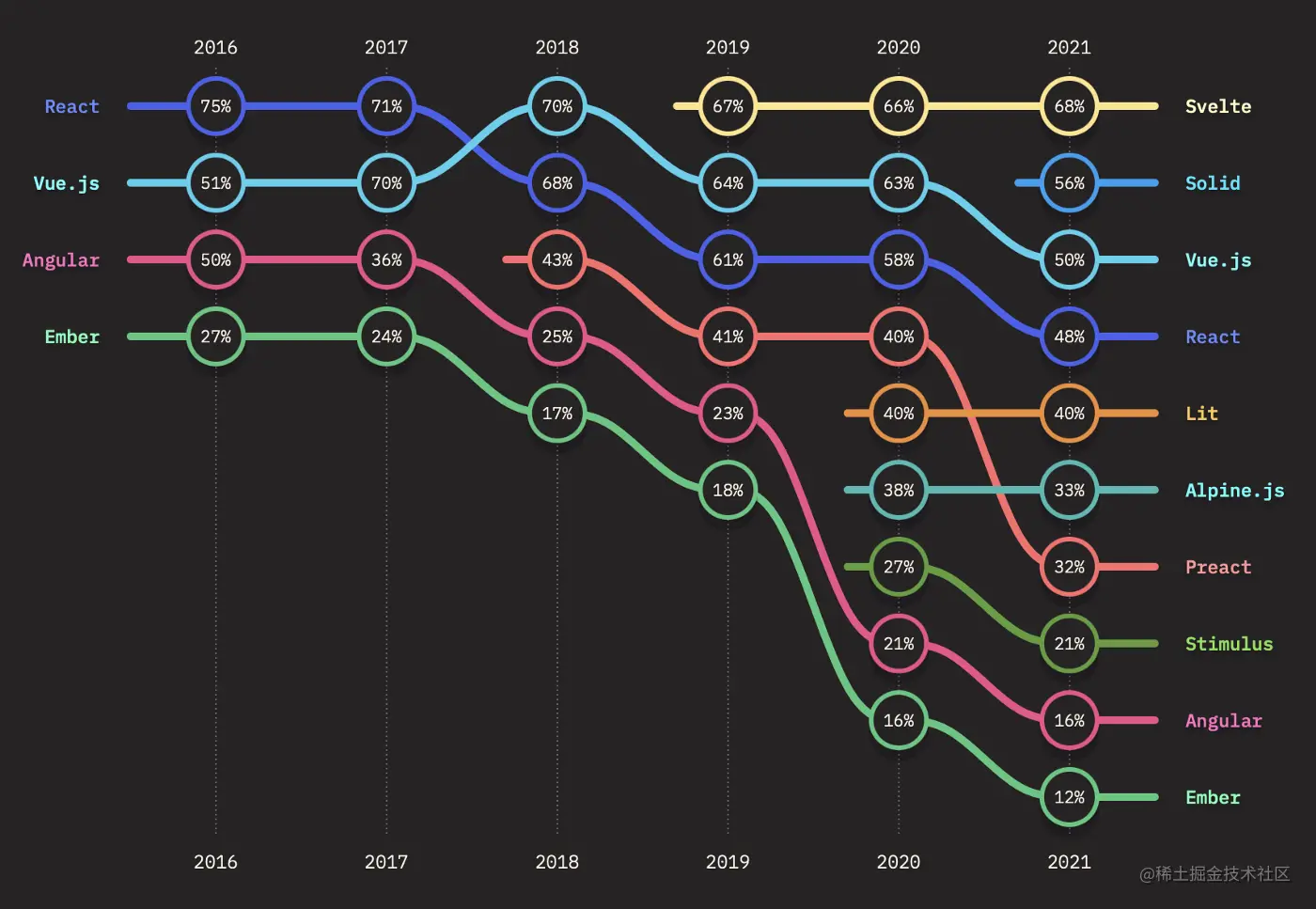 网络上经常会出现一些比较这些框架的文章,好像是在帮助我们解开这种困惑。但大多数作者通常是带有偏见的,因为他们可能“用过这个框架”,但“只尝试了一些其他的框架”。偏见程度较低的作者总是得出“这取决于具体情况”的结论(取决于性能、工具、支持、社区等),这实际上是一种非结论性的结论。