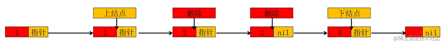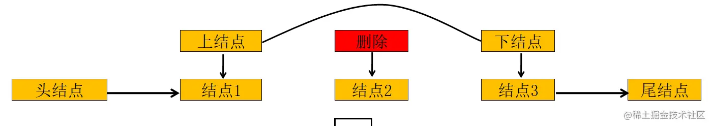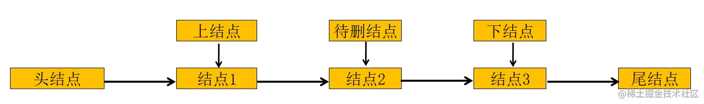 定义三个指针,分别是 待删结点 / 上结点 和 下结点, 分别指向 结点2/结点1/结点3