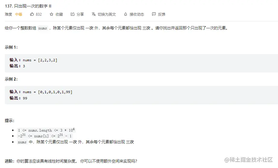 在写过136题目后,想非暴力破解方法时,总想的是直接利用数字做运算,利用 2 2 2 , 总想着能不能再加一个 2 ,然后做 ^ 运算,然后被摁在地上狠狠的锤,,, 总之,方法很重要吧,