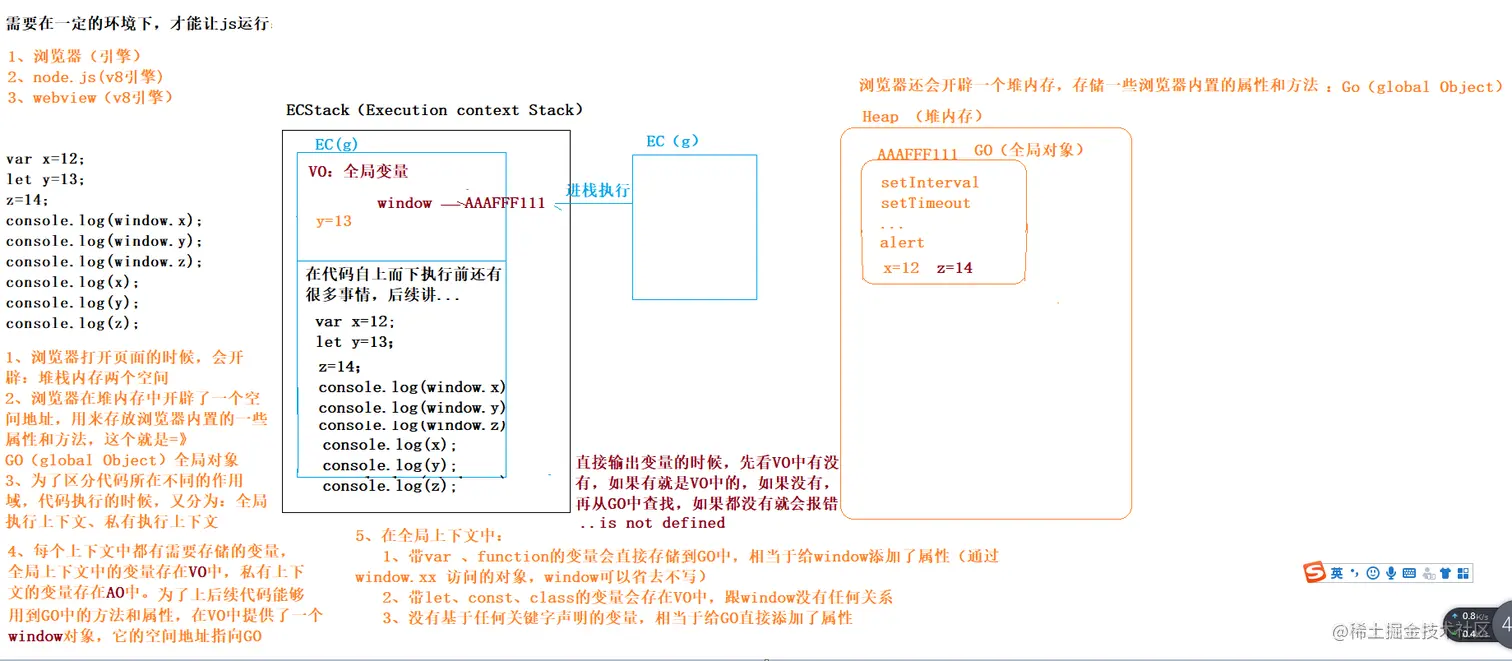 - GO:浏览器把一些内置的属性和方法放到了GO中,并且在全局执行上下文(EC(g))中创建了一个window变量对象,并且让其指向GO