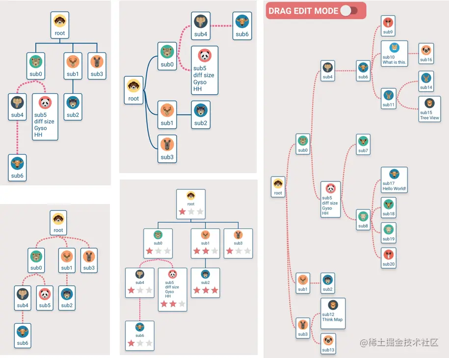 到到这里就介绍完,整个树状节点图的拖动放缩,添加删除节点,拖动编辑等这几个功能的实现原理了,当然里面还有很多实现细节。你可以把这篇文章作为源码查看的引导,细节方面也还有很多待完善的地方。后面这个开源应该会继续更新,大家也可以一起探讨,fork出来一起改。如果觉得不错请给个星呢。