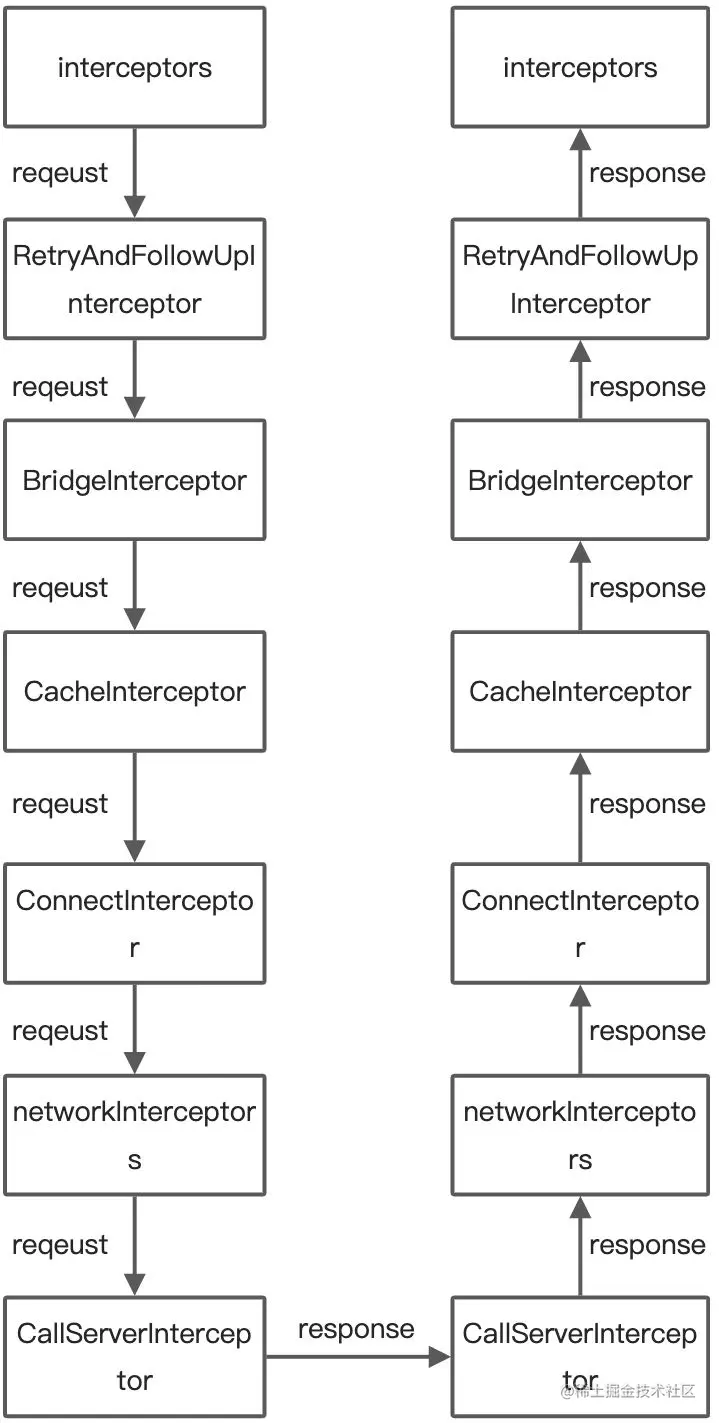 client.interceptors是我们通过OkHttpClient.Builder().addInterceptor()添加的自定义拦截器,需要注意的是,这里的Request是最干净的请求,没有被其它拦截器进行修改,一般我们可以添加日志信息打印拦截器、公共头参拦截器等;RetryAndFollowUpInterceptor用来重试、重定向操作的一个拦截器;BridgeInterceptor这个拦截器主要就是帮助我们补充一些请求信息,比如:conten_length,requestBody大小等信息;CacheInterceptor用来处理缓存,是否可以使用缓存数据等;ConnectInterceptor去和服务器建立连接,这里包括了三次握手;client.networkInterceptors是我们通过OkHttpClient.Builder().addNetworkInterceptor()添加的自定义网络拦截器,这里我们可以出来,它的调用前面已经经历了一些重定向、桥接、缓存拦截器,并不是原始的Request;CallServerInterceptor真正去执行内容请求的拦截器。