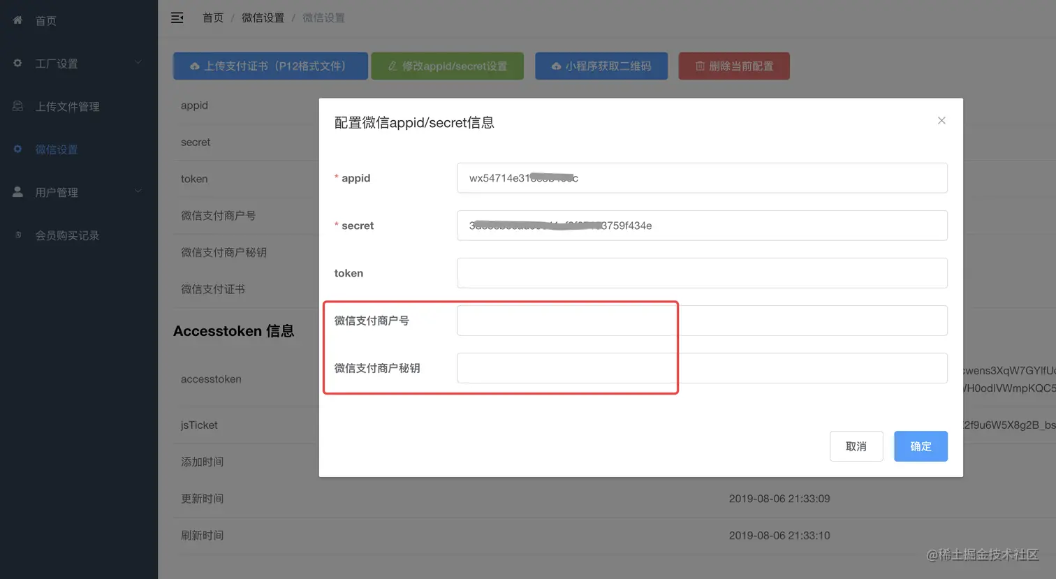 填写 “微信支付商户号” + “微信支付商户秘钥” ;