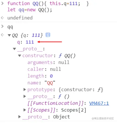 测试下来:new操作符会在新对象qq上初始化this开头属性。其他都保留在QQ.prototype上,仅用__proto__访问