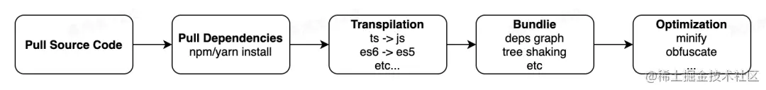 目前前端的构建涉及到下图所示的多个步骤( 依赖的拉取、依赖图分析、打包依赖... ),如果在敏捷开发的场景下,release分支需要经常更新,这无疑会造成流水线的阻塞;同时改动少数代码却导致整个构建流程进行,也造成了资源的浪费。