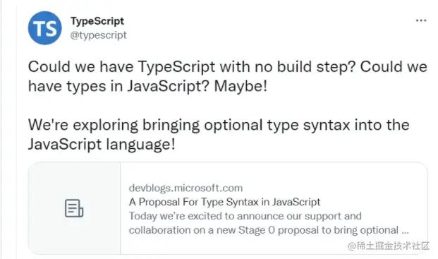 毕竟,TypeScript团队为了不让编译类型成为TypeScript代码到运行之间的唯一步骤,已经求生欲满满的提出了直接在JavaScript中支持类型的stage0提案。