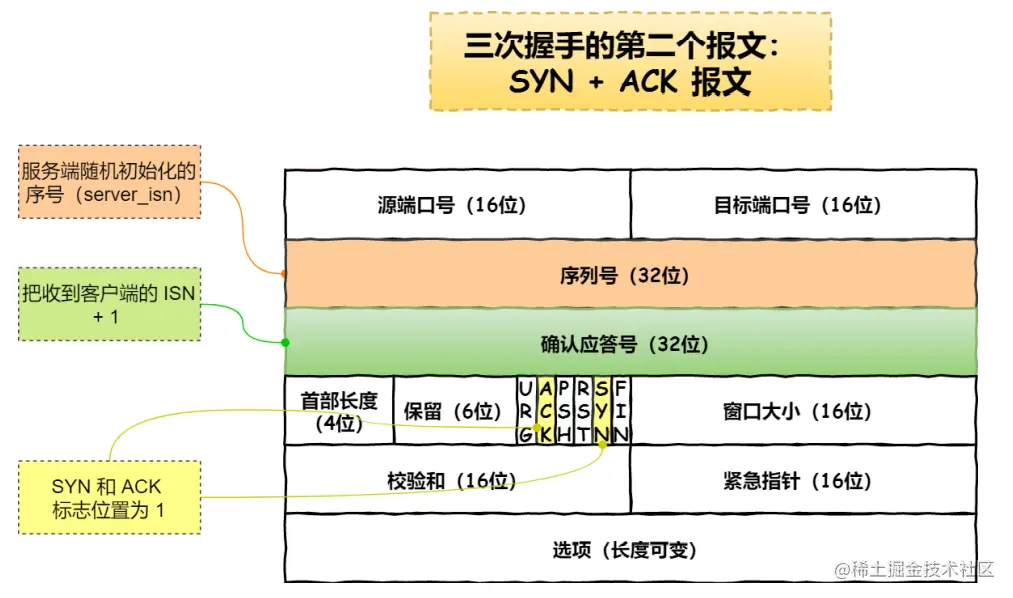 - 服务端收到客户端的SYN报文之后,首先服务端也随机初始化自己的序号(server_isn),并填入TCP首部的“序号”字段中,同时在”确认应答号“字段填入client_isn+1,接着把SYN和ACK标志位置1。最后将报文发送给客户端,接着处于SYN-RCVD状态。该报文不包含应用层数据。