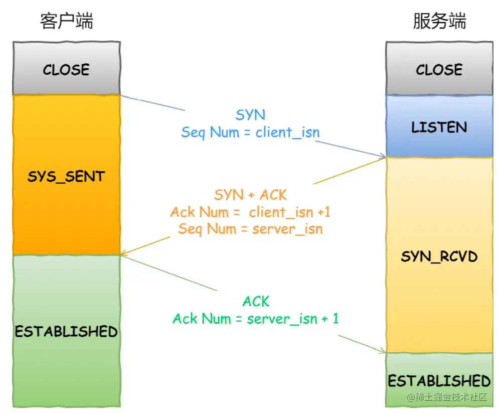 - 一开始,客户端和服务端都处于CLOSED状态,先是服务端主动监听某个端口,处于LISTEN状态。