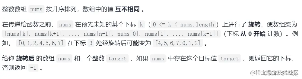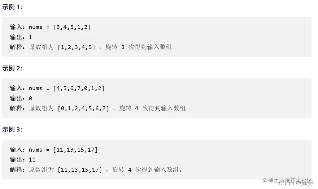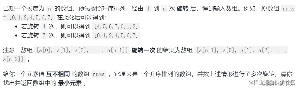 n == nums.length1 <= n <= 5000-5000 <= nums[i] <= 5000nums中的所有整数 互不相同nums原来是一个升序排序的数组,并进行了1至n次旋转