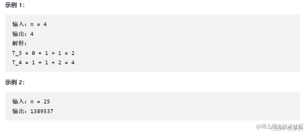 首先 n = 0 或者 n == 1 以及 2,分别都是返回 0 和 1的。再根据这个来做这道题思路:且在 n >= 0 的条件下 Tn+3 = Tn + Tn+1 + Tn+2。