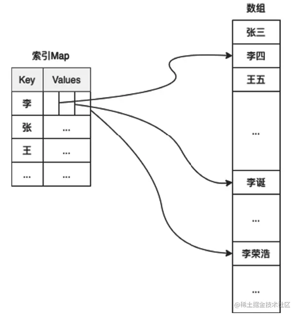 是否还有更好的办法呢?答案是肯定的。比如,我们可以用一个Map(在某些编程语言中是Dictionary)来为数组做一个索引,Key用于保存姓氏,值是所有这个姓氏的用户对象在数组中序号的集合,如图1所示。这样在查找的时候,就不用遍历数组了,只需要先在Map中查找,然后再根据序号直接去数组中获取用户数据即可,这样查找速度就快多了。