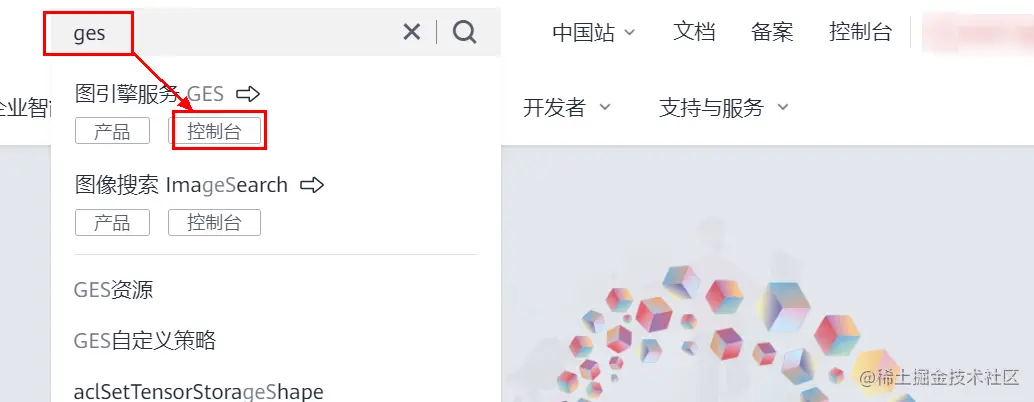 在搜索框中搜索ges,点击进入控制台: