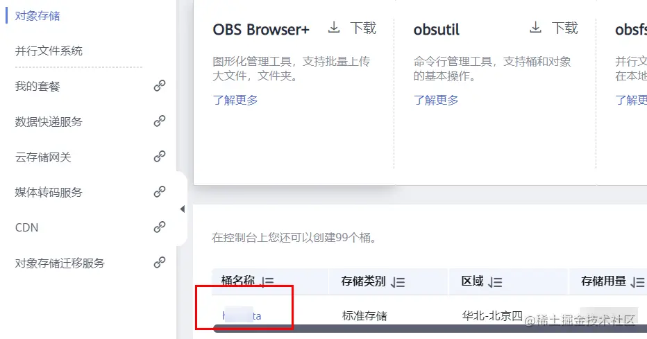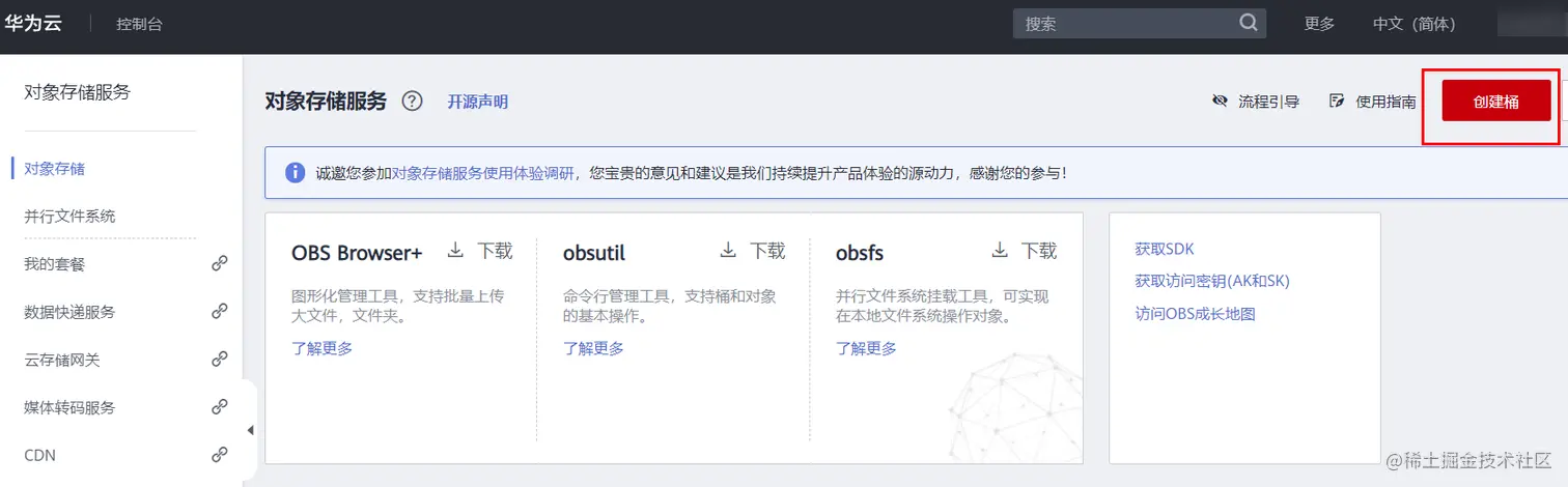 进入 OBS 界面之后,在右上角页面点击“创建桶”: