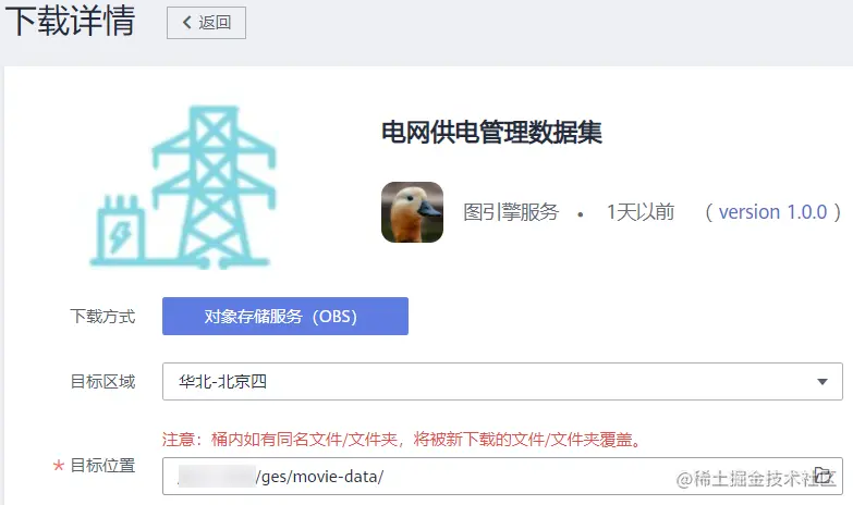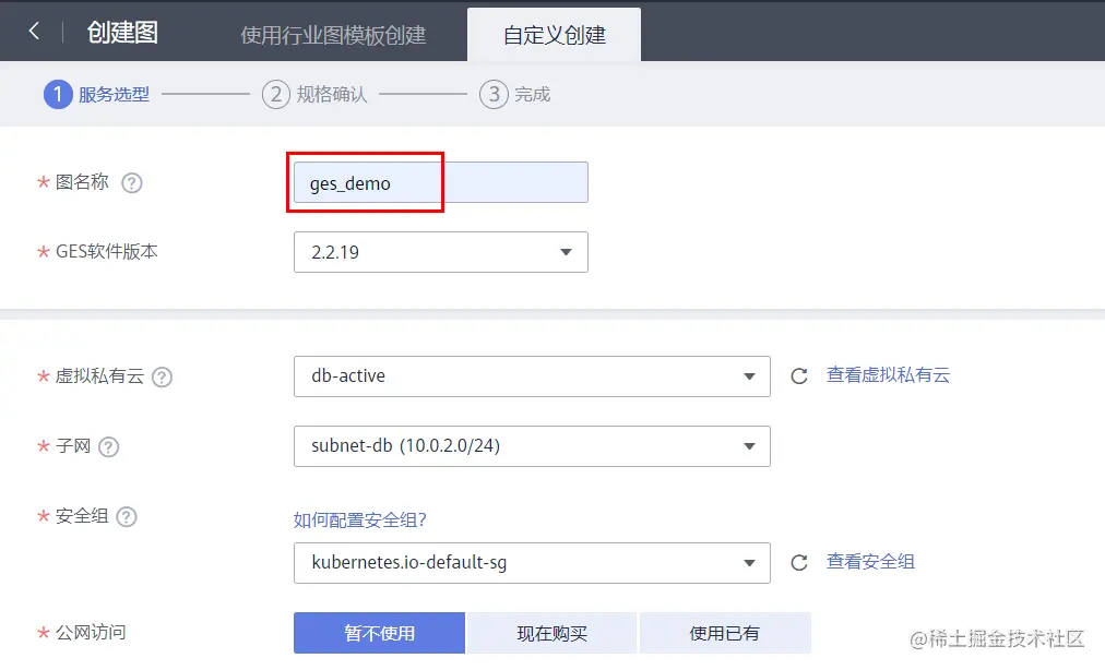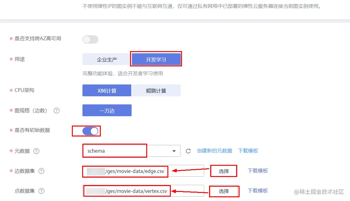 在创建图的界面,配置图的名称,“用途”,“是否有初始数据”选择开启,后面的“边数据集”和“点数据集”选择OBS中已经上传的对应数据。