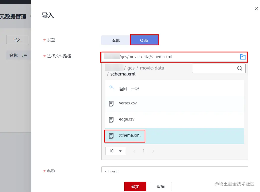 点击“导入”后弹出如下窗口,因为数据已经上传到OBS桶中,此处类型选择“OBS”,“选择文件路径”处选择我们上传到OBS中的schema.xml: