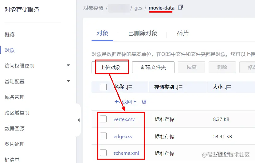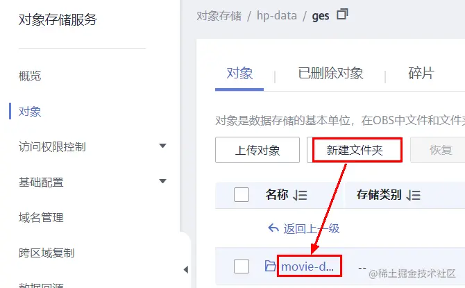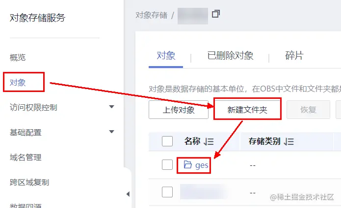 创建好之后,点击桶的名称,进入桶中,然后点击左侧“对象”,然后“新建文件夹”,创建“ges”文件夹: