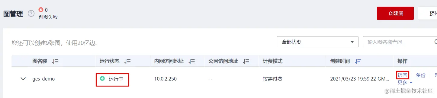 耐心等待,当图的运行状态变成“运行中”时,说明图已经创建完成。此时可点击右侧操作栏的“访问”或者调用API等方式对图进行查询、分析等操作。