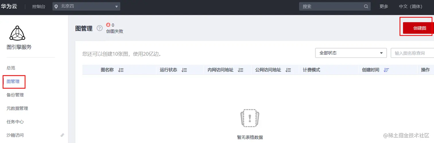 在图引擎服务界面,单击左侧菜单栏中“图管理”,进入“图管理”页面。然后单击右上角“创建图”。