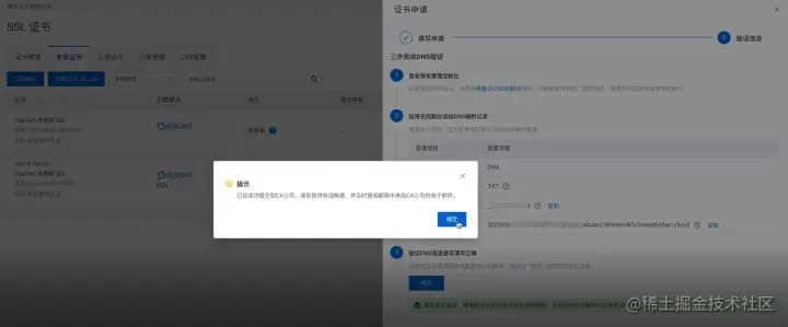 当“域名设置”页面信息确认提交后,我们需要稍等一会儿(一般不超过10分钟),等待域名服务器为我们的域名添加新的信息,才能回到“数字证书管理页面”点击验证。
