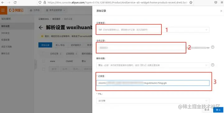 进入域名记录管理页面,我们需要将之前“数字证书管理页面”中的数据粘贴到域名记录中,以此验证我们对该域名的绝对控制权。所复制的信息内容,在“数字证书管理页面”中,都会带有“复制”按钮,也算是方便证书申请人的操作吧。