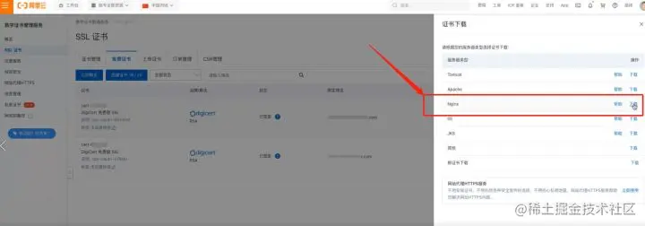 虽然证书种类繁多,我们只需要根据应用的系统下载对应证书即可。在这里我们选择“Nginx”类型的证书。