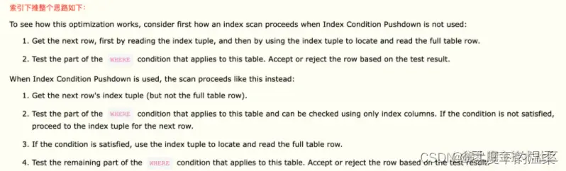 使用索引下推时,扫描过程如下: - 获取下一行的索引元组(不需要获取整行数据)