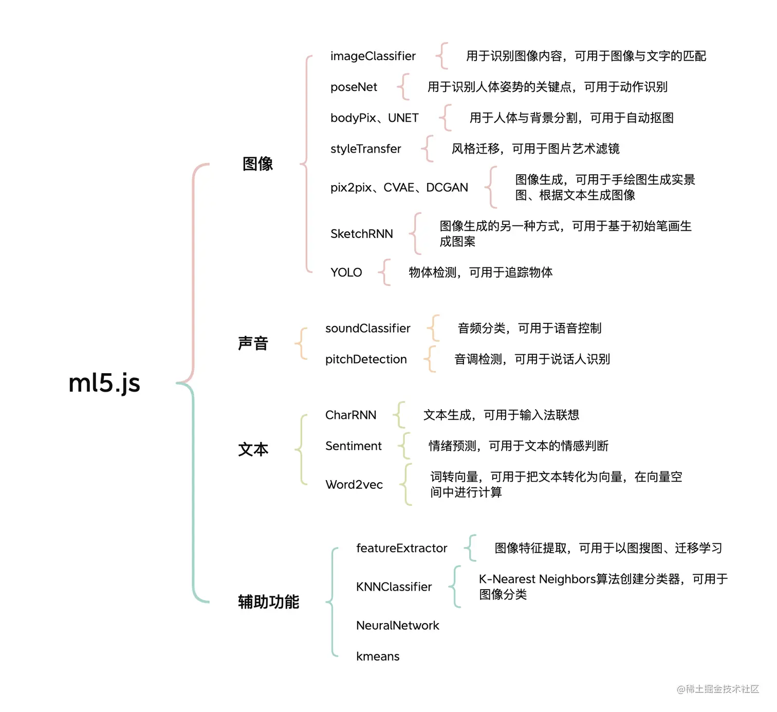 ml5js官方提供的机器学习案例类型有图像、声音和文本三个类别.