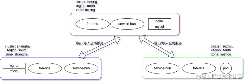 以上图为例,共有三个集群,北京集群是主集群,上海集群和苏州集群的 service-hub 都要通过北京集群的 service-hub 交换全局服务信息。北京和上海集群同时暴露了一个 nginx 服务和一个 mysql 服务,假设这些服务都是在 default 命名空间下。如果苏州集群的 pod 去访问 nginx.default.global,那么它会被上海集群的 nginx 背后的 pod 响应,为什么呢?因为苏州和上海的 region 都是 south,而它自己本身并没有提供 nginx 服务或者没有暴露这个服务; 如果上海或北京的一个 pod 去访问 nginx.default.global,那么响应的 pod 只会是各自集群的 pod,因为 zone 是匹配的。