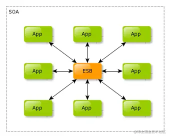 这时 ESB 企业服务总线便应运而生。通过下图可以发现,所有服务皆和 ESB 连接,ESB 就像是人身体中的心脏,连接了各个服务节点。