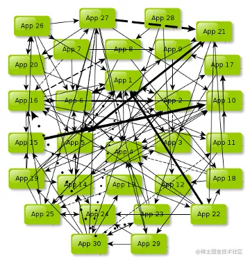 在 SOA 架构下,随着业务越来越复杂,服务越来越多,他们的调用关系图会变成如下图所示的情况。