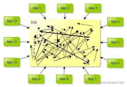 虽然 ESB 系统解决了 SOA 架构所带来的问题。但是随着互联网快速发展,人们对于互联网的日常依赖不仅越来越深,同时也对互联网应用要求越来越高。响应时间超过一两秒都可能直接降低用户的体验感,造成客户的流失。同时,随着业务发展,服务越来越多的情况下,ESB 内部调用关系在不梳理的情况下就会变成如下图所示的混乱情况。